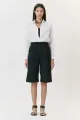 Peça feita em algodão sarjado na cor Preta. Bermuda de alfaiataria reta longa com prega rasa e vinco na perna. Detalhe frontal com tampa sugerindo bolsinho extra. Possui cós reto, bolsos faca nas laterais e bolsos traseiros de casa inglesa. Fechamento frontal por zíper e colchetes. O tecido utilizado possui baixa elasticidade.