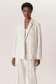 Peça feita em algodão sarjado na cor Off White com padrão riscas de giz. Blazer de alfaiataria reto sem ombreiras. Possui transpasse frontal com fechamento por botões e bolsos embutidos de casa inglesa.