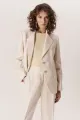 Peça feita em linho puro na cor Marfim. Blazer de alfaiataria reto, com ombreiras e bolsos embutidos de casa inglesa com tampa. Possui transpasse frontal suave e arredondado e fechamento por botões.