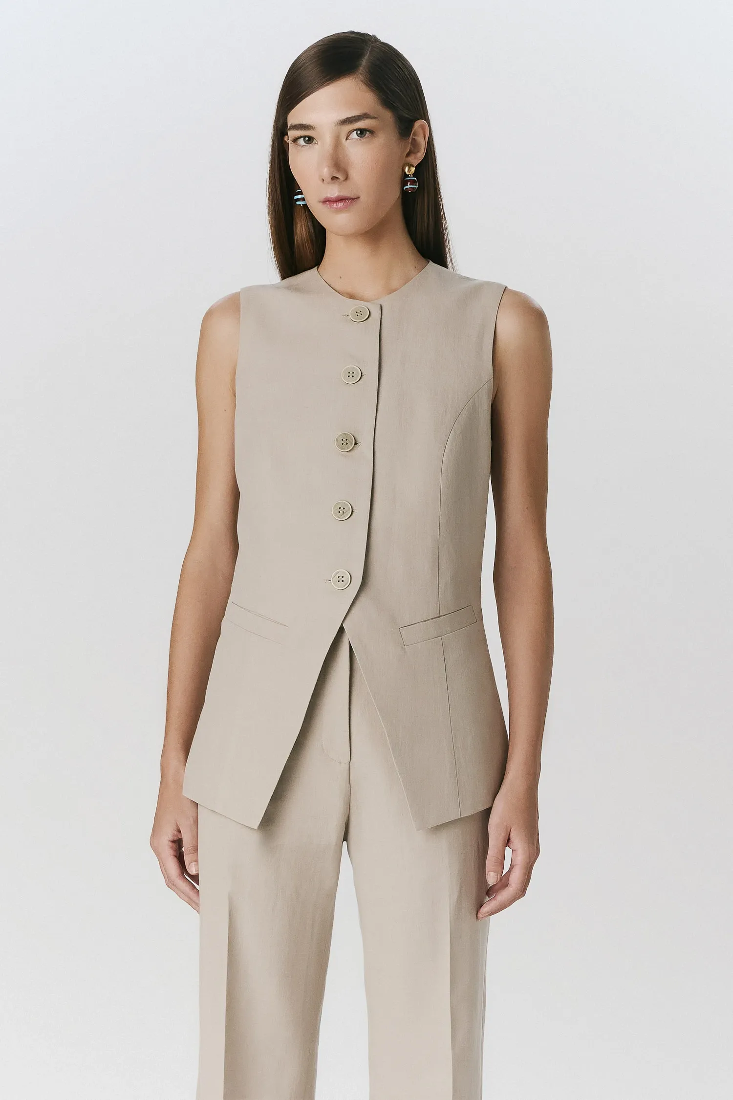 Blusa de alfaiataria em linho com algodão na cor Taupe. A peça é estruturada, com modelagem acinturada e abrindo levemente no quadril. Modelo sem mangas, possui bolsos de casa inglesa e fechamento frontal por botões. O tecido utilizado não possui elasticidade.