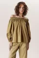 Peça feita em tricoline de algodão na cor Bambu. Blusa ombro a ombro com shape box, decote com elástico franzido ao redor e mangas bufantes. Possui acabamento no decote com babadinho e punhos franzidos com elástico.