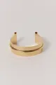 Bracelete flexível em chapa de metal larga com fio redondo sobreposto no centro. Finalização curvada nas extremidades da peça. Produto fabricado com técnicas de ourivesaria em metal com banho ouro 18K.