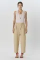 Calça de alfaiataria em algodão sarjado na cor Cáqui. A peça possui modelagem reta solta do corpo com pregas na cintura e bolsos faca nas laterais. O modelo possui cós largo com transpasse frontal e regulagem nas laterais através de tiras e botões. Por ter regulagem, este modelo pode ser usado com cintura alta ou com cintura baixa. Fechamento frontal por botões e zíper. O tecido utilizado possui baixa elasticidade.