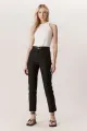 Peça feita em algodão acetinado na cor Preta. Calça de alfaiataria com perna reta e bolsos faca nas laterais. Possui cós reto com passantes para cinto e fechamento frontal por zíper e colchetes.