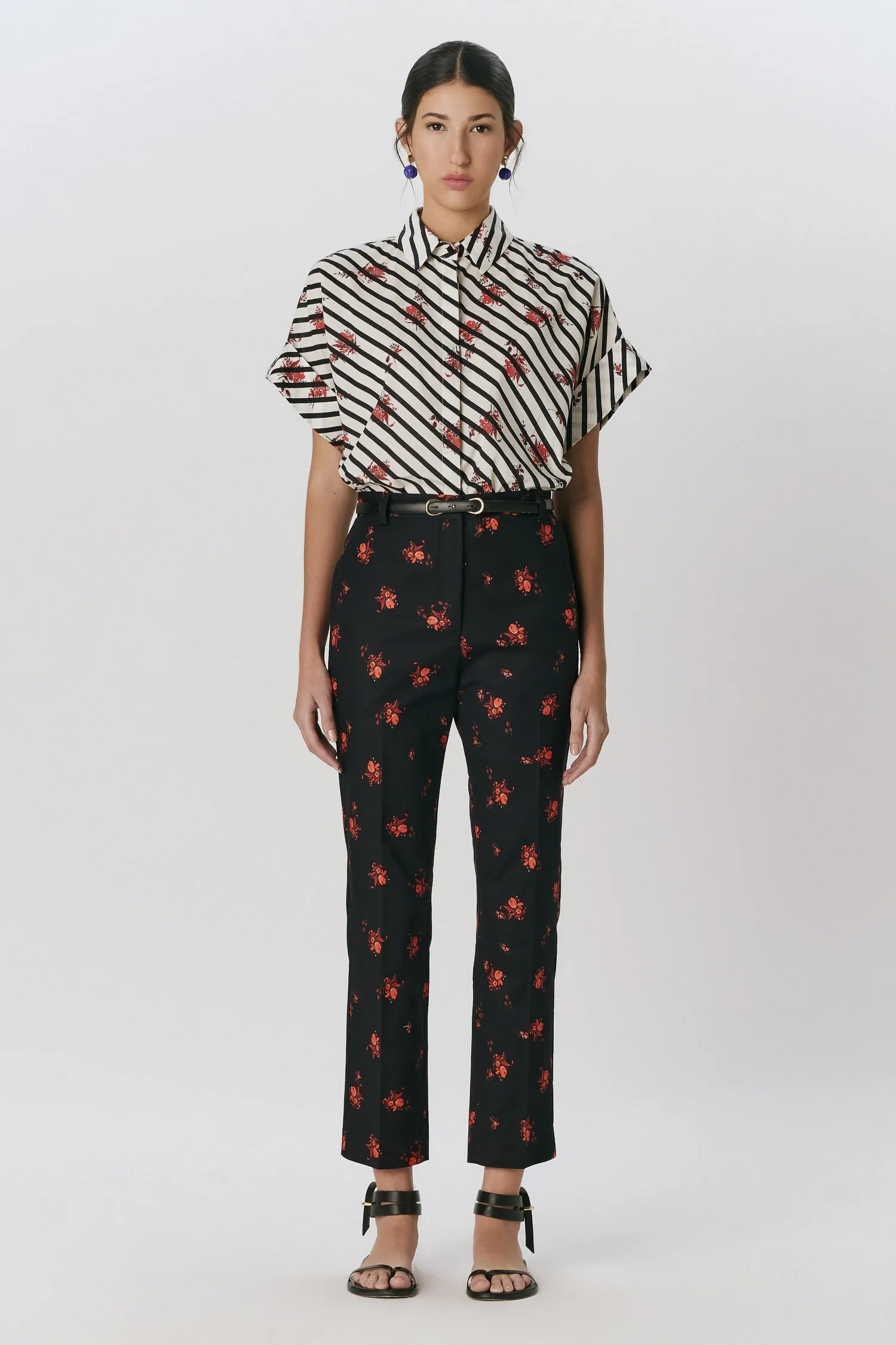 Calça de alfaiataria em algodão acetinado na estampa Tulipa Preta. O modelo possui caimento reto com modelagem próxima ao corpo, cintura regular, bolsos faca nas laterais e bolsos traseiros de casa inglesa. Fechamento frontal por zíper e colchetes. O tecido utilizado possui baixa elasticidade.