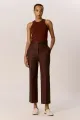 Calça de alfaiataria em algodão acetinado na cor Café. O modelo é semi flare*, com cintura alta e vinco nas pernas. Possui cós reto, passadores para cinto e bolsos faca nas laterais. Fechamento frontal por zíper e colchetes. O tecido utilizado possui baixa elasticidade.