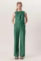 Peça feita em algodão acetinado na cor Esmeralda. Calça de alfaiataria com cintura alta, pernas longas e levemente wide*. Possui cós reto e bolsos faca nas laterais. Fechamento frontal por zíper e colchetes.