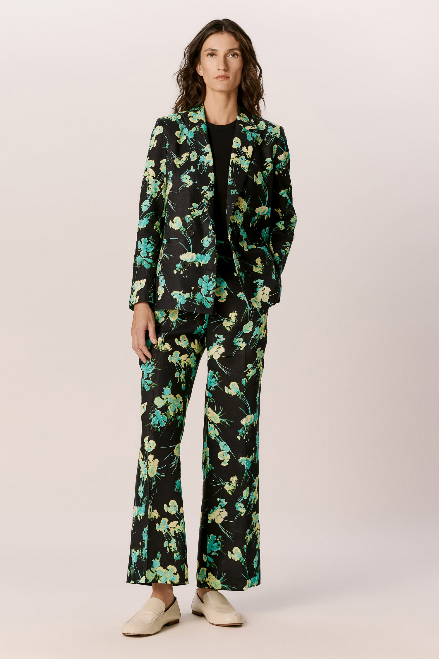 Calça de alfaiataria em linho na estampa Hibisco Turquesa. O modelo é reto com cintura regular, bolsos faca nas laterais e bolsos traseiro de casa inglesa. Fechamento frontal por zíper e colchetes. O tecido utilizado não possui elasticidade.