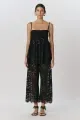 Calça ampla em renda na cor Preta. O modelo possui perna ampla e cintura alta com cós reto em algodão. Fechamento por zíper invisível na lateral. A peça também acompanha uma hotpants avulsa em malha Preta para velar transparência da renda. O tecido utilizado não possui elasticidade e possui transparência.