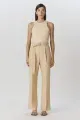 Calça de alfaiataria em algodão empapelado na cor Cáqui. A peça possui modelagem reta e levemente ampla com cintura alta e pregas rasas. O modelo possui cós reto, bolsos faca nas laterais e bolsos traseiros chapados. Fechamento frontal por zíper e colchetes. Acompanha cinto faixa avulso do mesmo tecido com fivela de metal. O tecido utilizado não possui elasticidade.