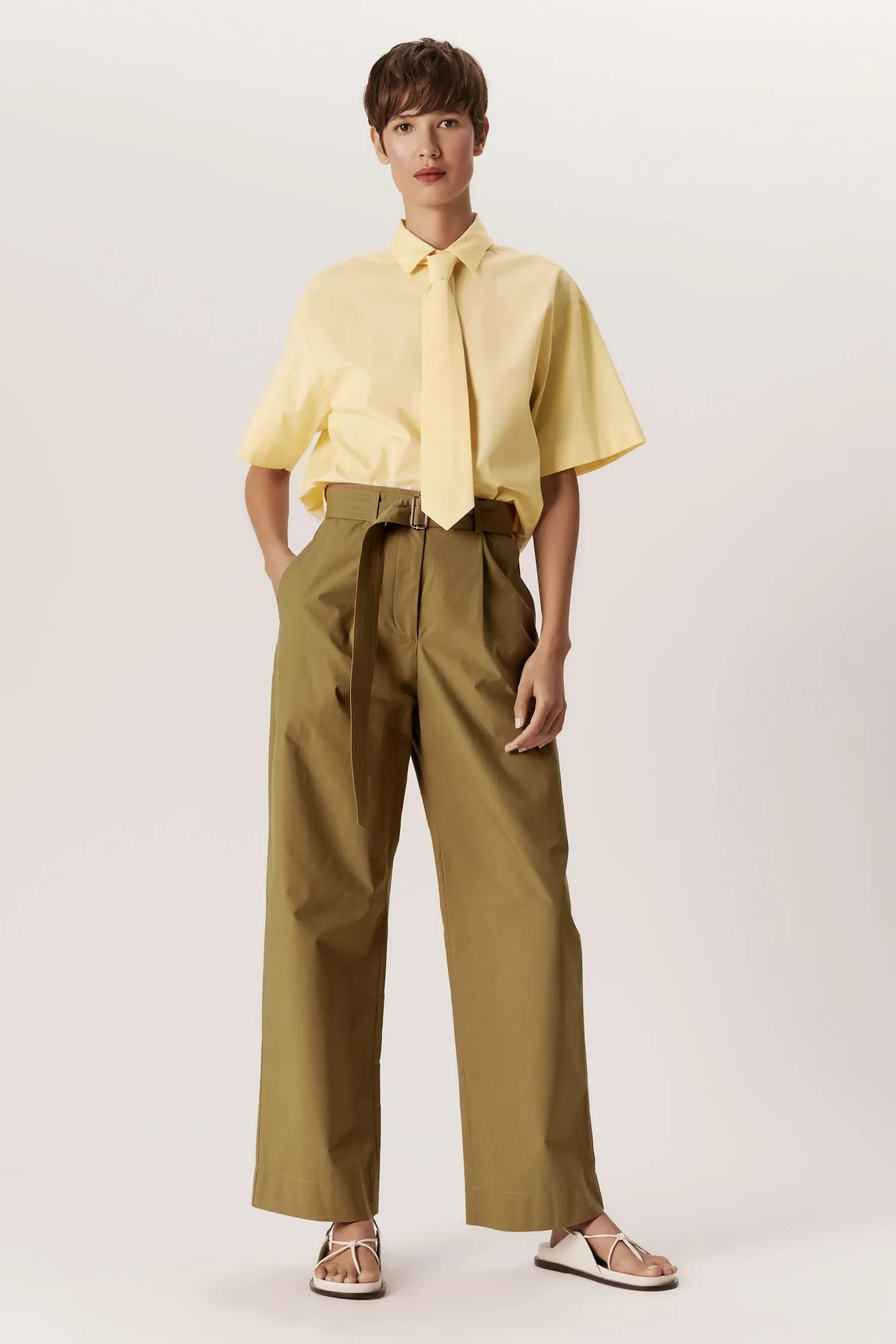 Peça feita em algodão empapelado na cor Eucalipto. Calça reta e longa com pregas rasas. Possui cós reto, bolsos faca laterais e bolsos traseiro. Fechamento frontal por zíper e colchetes. Acompanha cinto avulso pespontado do mesmo tecido com fivela de metal níquel.