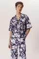 Peça feita em voil de algodão na estampa Floral Índigo. Camisa de mangas curtas com shape box e gola cubana. Fechamento principal frontal por botões.
