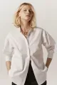 Peça feita em tricoline de algodão na cor Branca. Camisa de mangas longas gigot* com franzido no ombro e punhos. Possui gola padre e fechamento principal frontal por botões não aparentes.