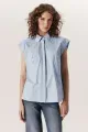 Peça feita em tricoline de algodão na cor Azul Claro. Camisa sem mangas, com shape box oversized*, dois bolsos laterais de casa inglesa. Fechamento principal frontal por botões não aparentes.