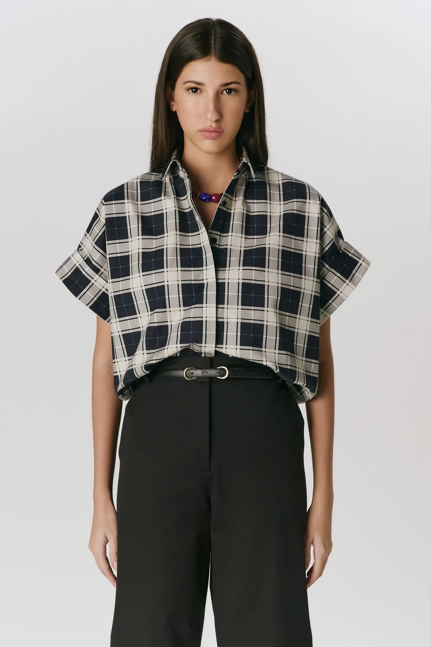 Camisa em algodão compacto na estampa Xadrez PB. A peça possui mangas curtas dobradas e modelagem ampla. O modelo possui ombro levemente deslocado, colarinho e barra arredondada nas laterais. Fechamento frontal por botões não aparentes. O tecido utilizado não possui elasticidade.