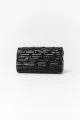 Bolsa clutch de bambu laqueado Preto. A peça é rígida e possui formato retangular com fechamento magnético. A bolsa possui forro em tecido liso e acompanha alça de corrente longa em metal ouro-velho com encaixe removível por mosquetão.