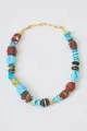 Colar com sequência de cristais de murano em formatos variados e tons de turquesa, caramelo e marrom. Possui finalização em uma das extremidades com corrente extensora e na outra com fecho de gancho. Produto fabricado com técnicas de ourivesaria em metal com banho ouro 24K.