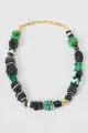 Colar com sequência de cristais de murano em formatos variados e tons de verde, preto e branco. Possui finalização em uma das extremidades com corrente extensora e na outra com fecho de gancho. Produto fabricado com técnicas de ourivesaria em metal com banho ouro 24K.