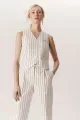Peça feita em algodão sarjado na cor Off White com padrão riscas de giz. Colete de alfaiataria reto, estruturado e curto. Possui bolsos frontais de casa inglesa e transpasse frontal suave com fechamento por botões. O detalhe nas costas com tiras e argolas permite um ajuste leve da cintura.