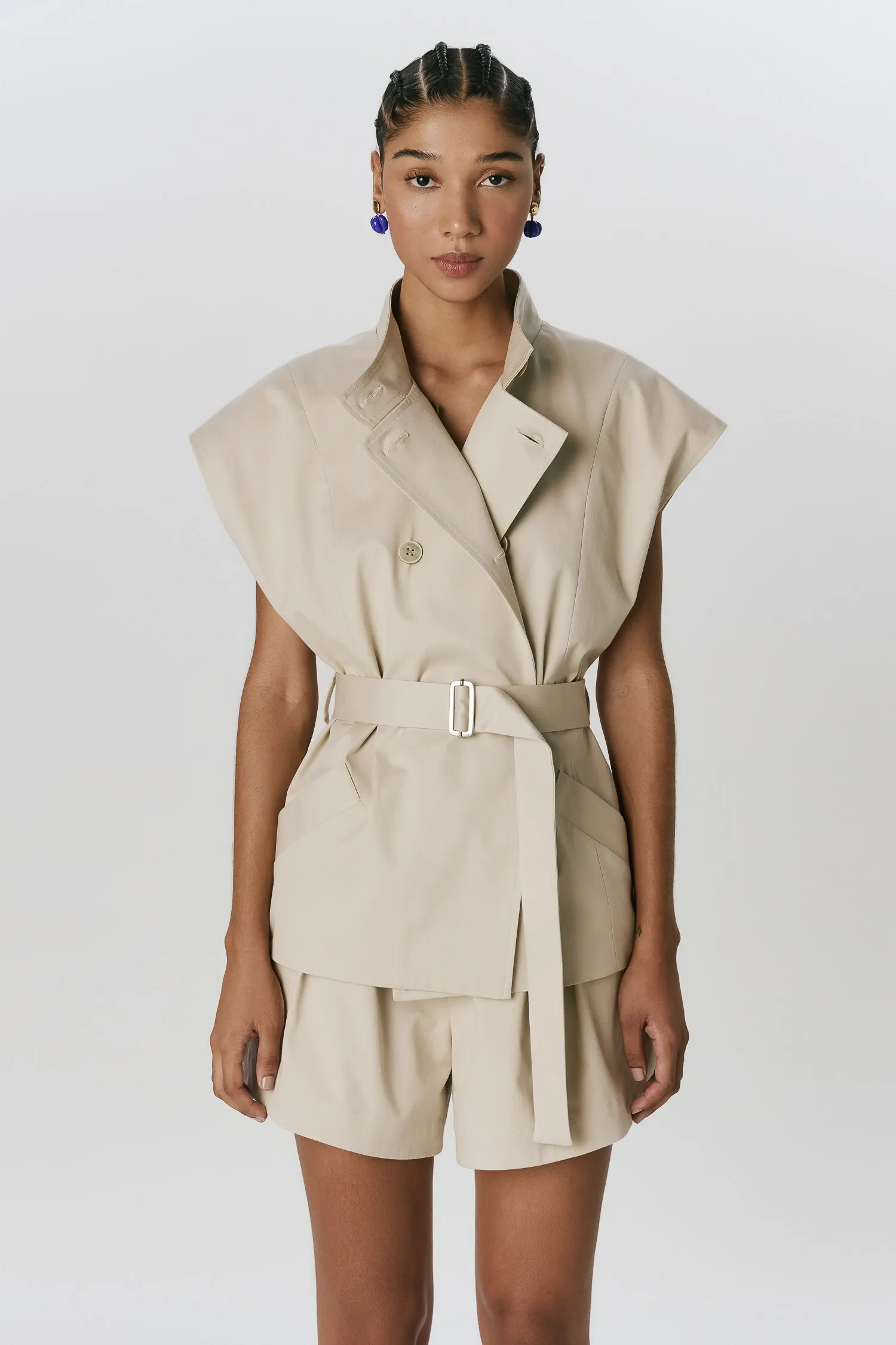 Colete tipo trench em algodão sarjado na cor Areia. O modelo possui modelagem ampla, ombro deslocado, gola alta e transpasse frontal com abotoamento duplo. Possui bolsos de casa inglesa nas laterais. Acompanha cinto faixa avulso do mesmo tecido com fivela de metal. O tecido utilizado possui baixa elasticidade.