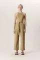 Peça feita em algodão sarjado na cor Bambu. Macacão de alfaiataria sem mangas com decote nadador, corpo estruturado e calça reta com bolsos cargo. Possui também bolsos faca nas laterais, bolsos traseiros e fechamento por zíper invisível no centro das costas. Acompanha cinto fino avulso do mesmo tecido com meia argola de metal níquel.
