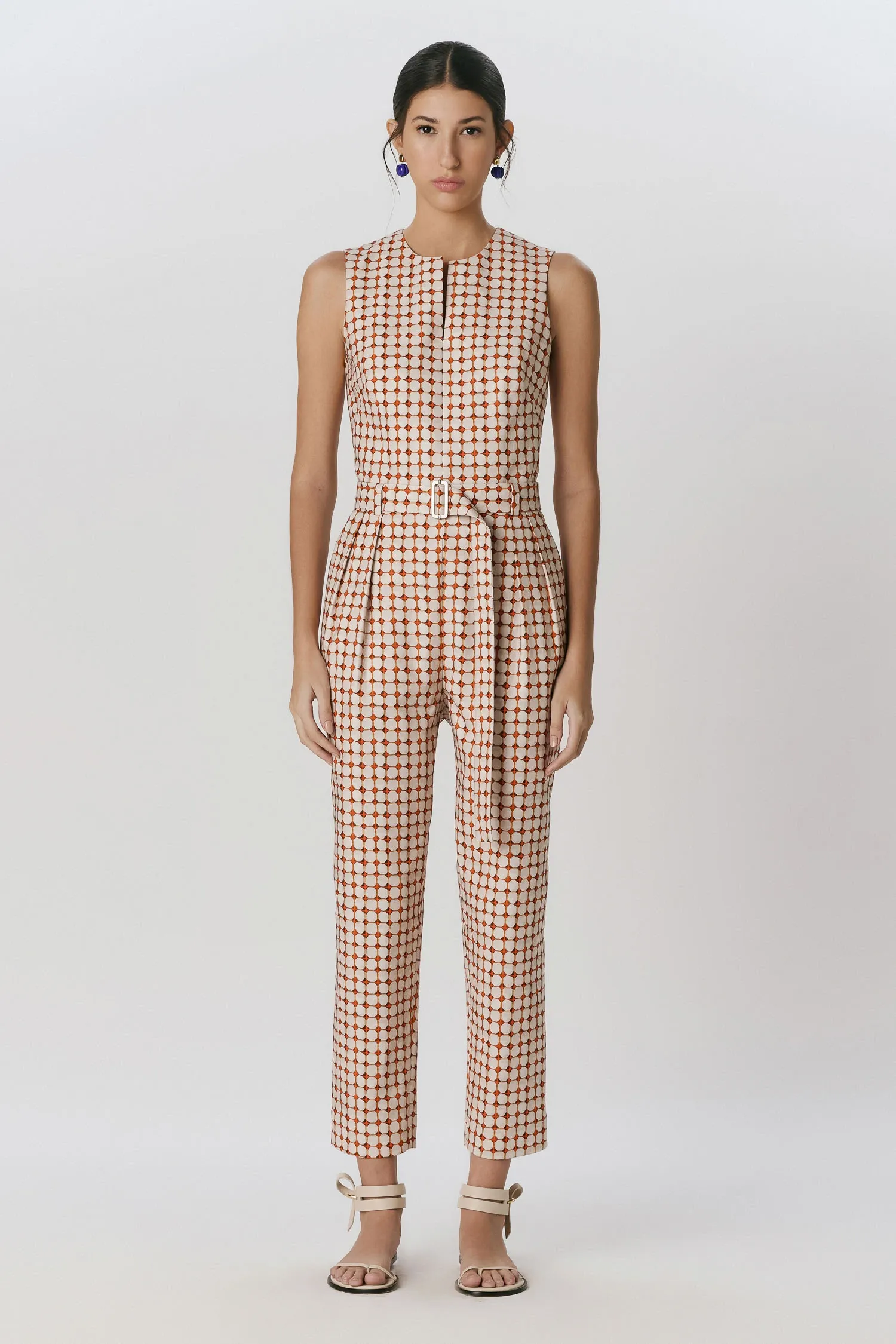 Macacão de alfaiataria em algodão acetinado na estampa Azulejo. O modelo possui top estruturado e ajustado ao corpo, sem mangas e com decote redondo com fenda no centro. A modelagem da calça é cenoura* com pregas na cintura e bolsos faca nas laterais. Fechamento por zíper invisível no centro das costas. O tecido utilizado possui baixa elasticidade.