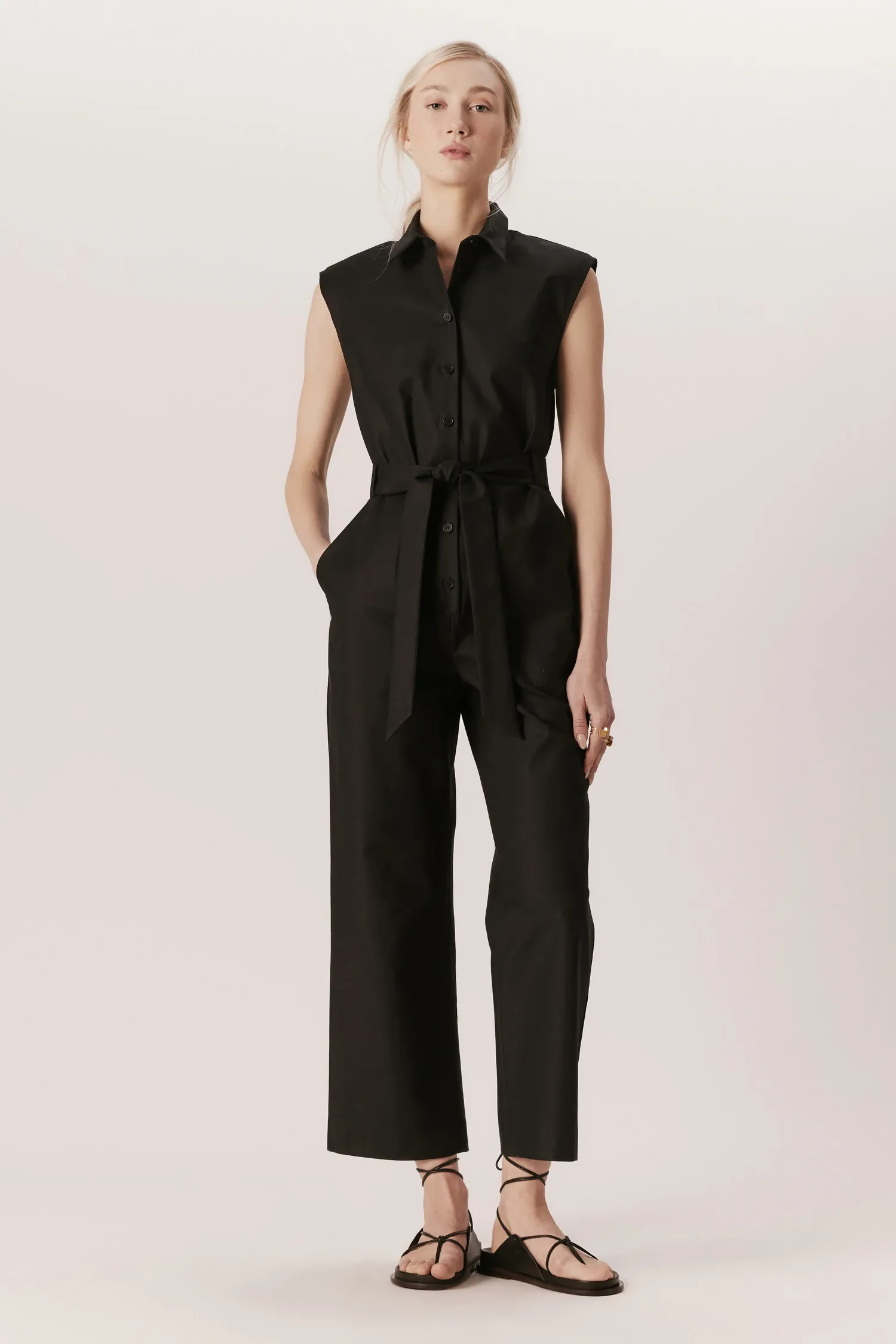 Peça feita em algodão acetinado na cor Preta. Macacão de alfaiataria sem mangas, com ombreiras embutidas para sustentar o ombro. Possui bolsos faca nas laterais, bolsos traseiros e passantes para cinto. Fechamento frontal por botões não aparentes. Acompanha faixa avulsa do mesmo tecido para cintura.