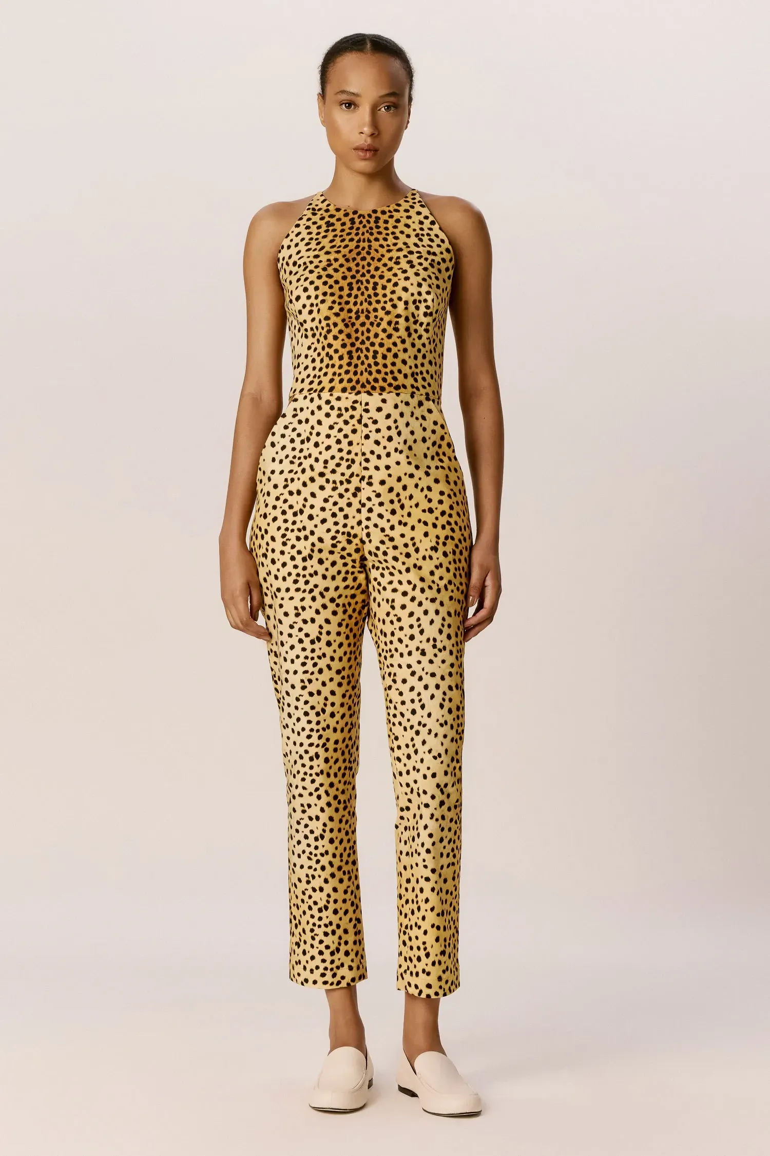 Macacão de alfaiataria em algodão acetinado na estampa Cheetah. Modelo estruturado, com modelagem justa ao corpo, sem mangas e com decote alto sustentado por alças finas. A modelagem da calça é reta com bolso faca nas laterais. Fechamento por zíper invisível no centro das costas. O tecido utilizado possui baixa elasticidade.