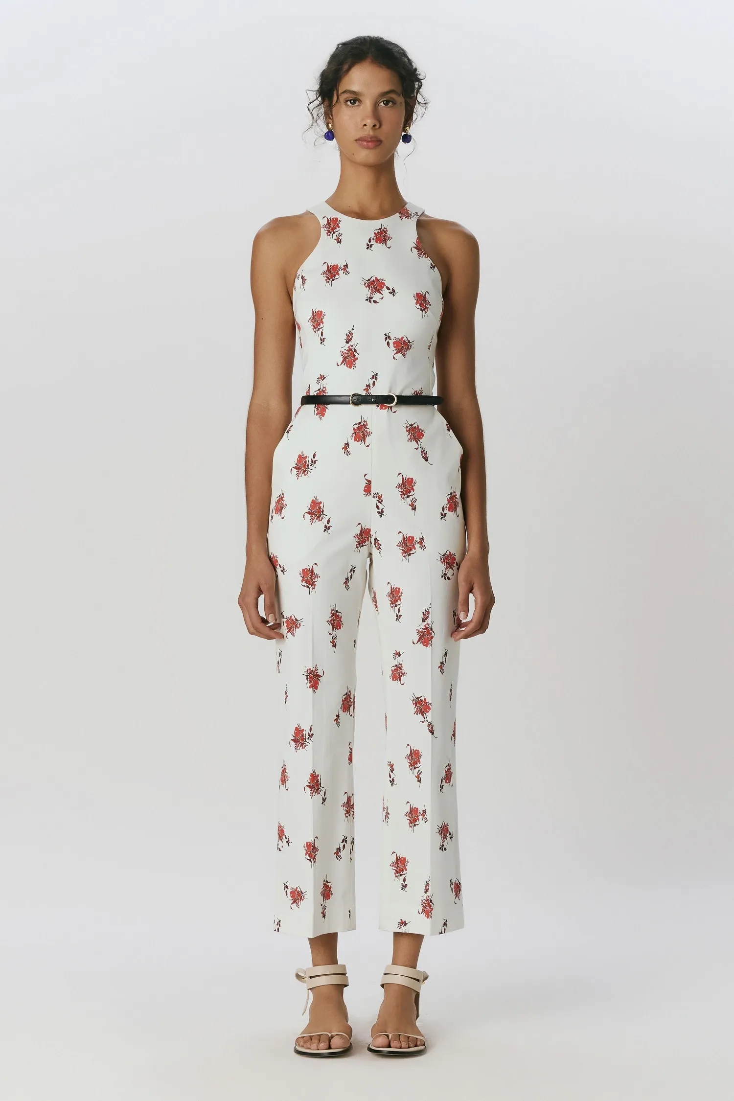 Macacão de alfaiataria em algodão acetinado na estampa Tulipa Off White. O modelo é estruturado, com modelagem justa ao corpo, sem mangas e com decote nadador. A modelagem da calça é semi flare* com bolsos faca nas laterais. Fechamento por zíper invisível no centro das costas. O tecido utilizado possui baixa elasticidade.