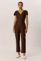 Macacão de alfaiataria em algodão acetinado na cor Café. Modelo com top estruturado e ajustado ao corpo, com decote V sutil, recorte lateral que acintura a silhueta e mangas curtas sem cava. A modelagem da calça é reta com bolsos faca nas laterais. Fechamento por zíper invisível no centro das costas. O tecido utilizado possui baixa elasticidade.