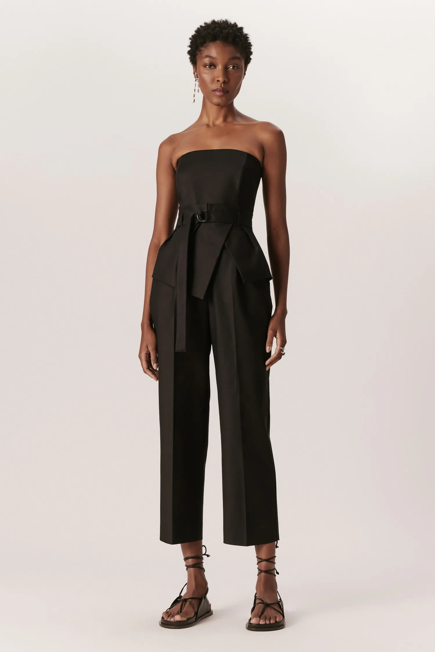 Peça feita em algodão acetinado na cor Preta. Macacão de alfaiataria tomara que caia com decote reto e corpete estruturado. Possui basque clochard aplicada e calça reta com pregas rasas. Bolsos faca laterais e fechamento por zíper invisível no centro das costas. Acompanha cinto fino avulso do mesmo tecido com meia argola de metal níquel.