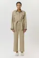 Macacão utilitário em algodão compacto acetinado na cor Sépia. Com caimento reto e modelagem levemente solta do corpo o modelo possui mangas longas, punhos com abotoamento e recorte superior pespontado. A peça conta com bolsos frontais com aba, bolsos faca nas laterais e bolsos traseiros. Possui recorte na cintura com passantes para cinto e vista frontal com abotoamento embutido.