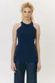 Regata nadador em malha canelada na cor Marinho. A peça apresenta modelagem ajustada ao corpo, sem mangas e com comprimento regular. Possui decote redondo e alças largas com cavas profundas destacando os ombros.