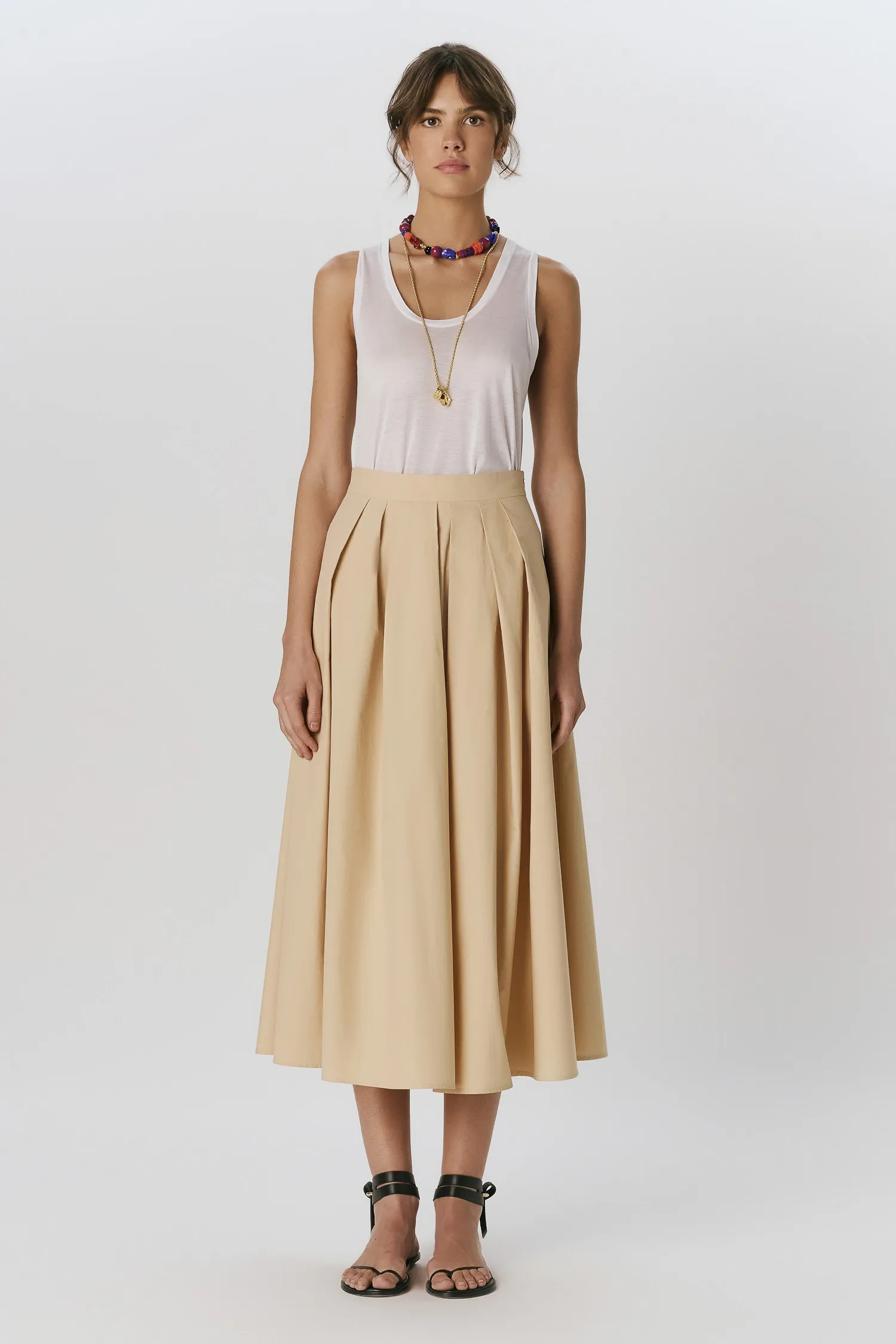 Saia midi em algodão empapelado na cor Cáqui. O modelo possui pregas irregulares na cintura com modelagem solta do corpo. A peça possui cintura alta com cós reto e bolsos embutido nas laterais. Fechamento por zíper invisível na lateral. O tecido utilizado não possui elasticidade.