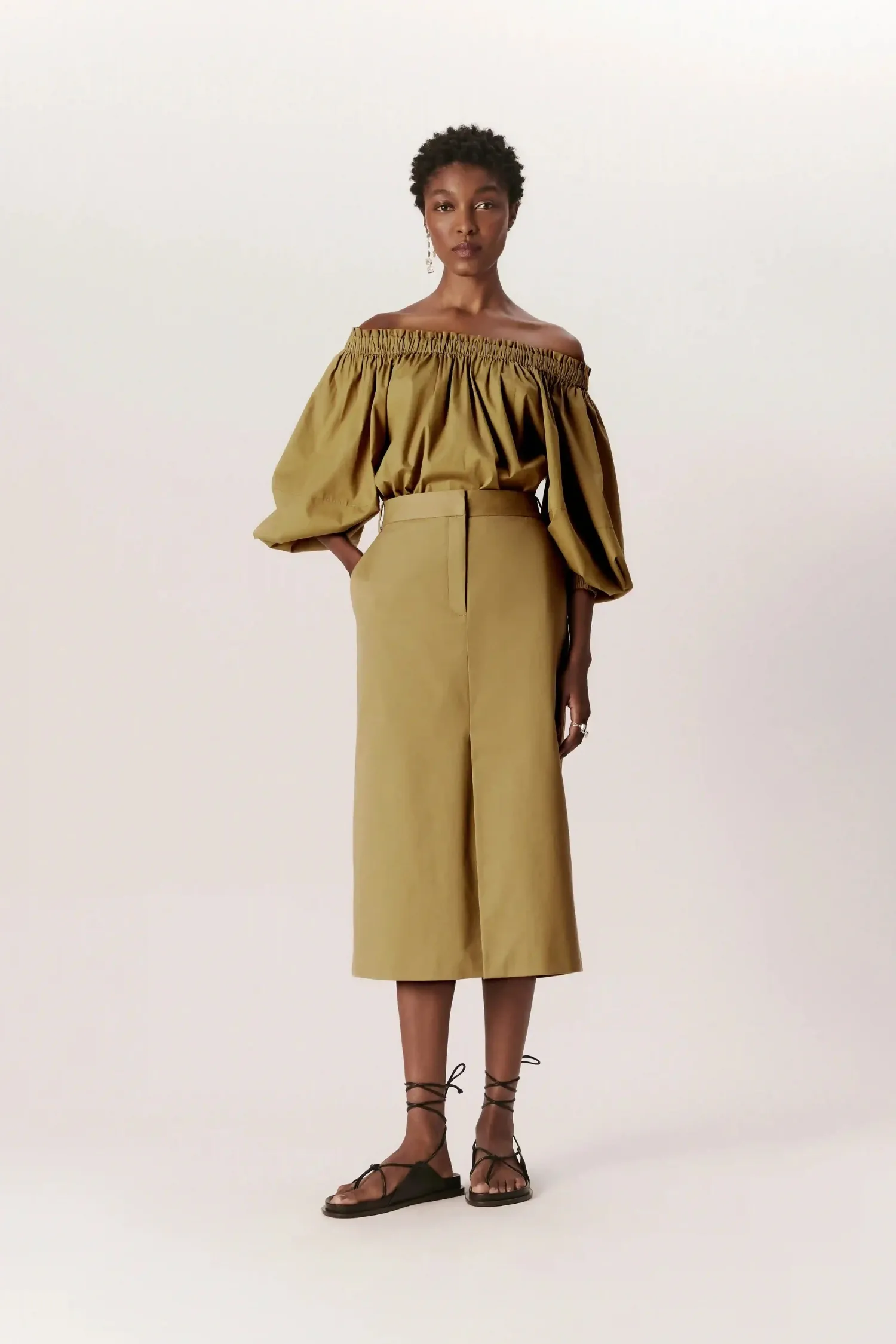 Peça feita em algodão sarjado na cor Bambu. Saia midi de alfaiataria com shape reto, fenda no centro frente e bolsos faca laterais. Possui cós reto com passantes para cinto, bolsos traseiros de casa inglesa. Fechamento frontal por zíper e colchetes.