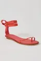 Sandália rasteira em couro legítimo na cor Vermelha. A peça possui tiras largas ao redor do tornozelo com fechamento por pino de metal e tira fina para laçar na lateral. O modelo possui tira delicada no dorso dos dedos e sola fachetada com vira larga na cor caramelo. O fechamento lateral possui regulagem.