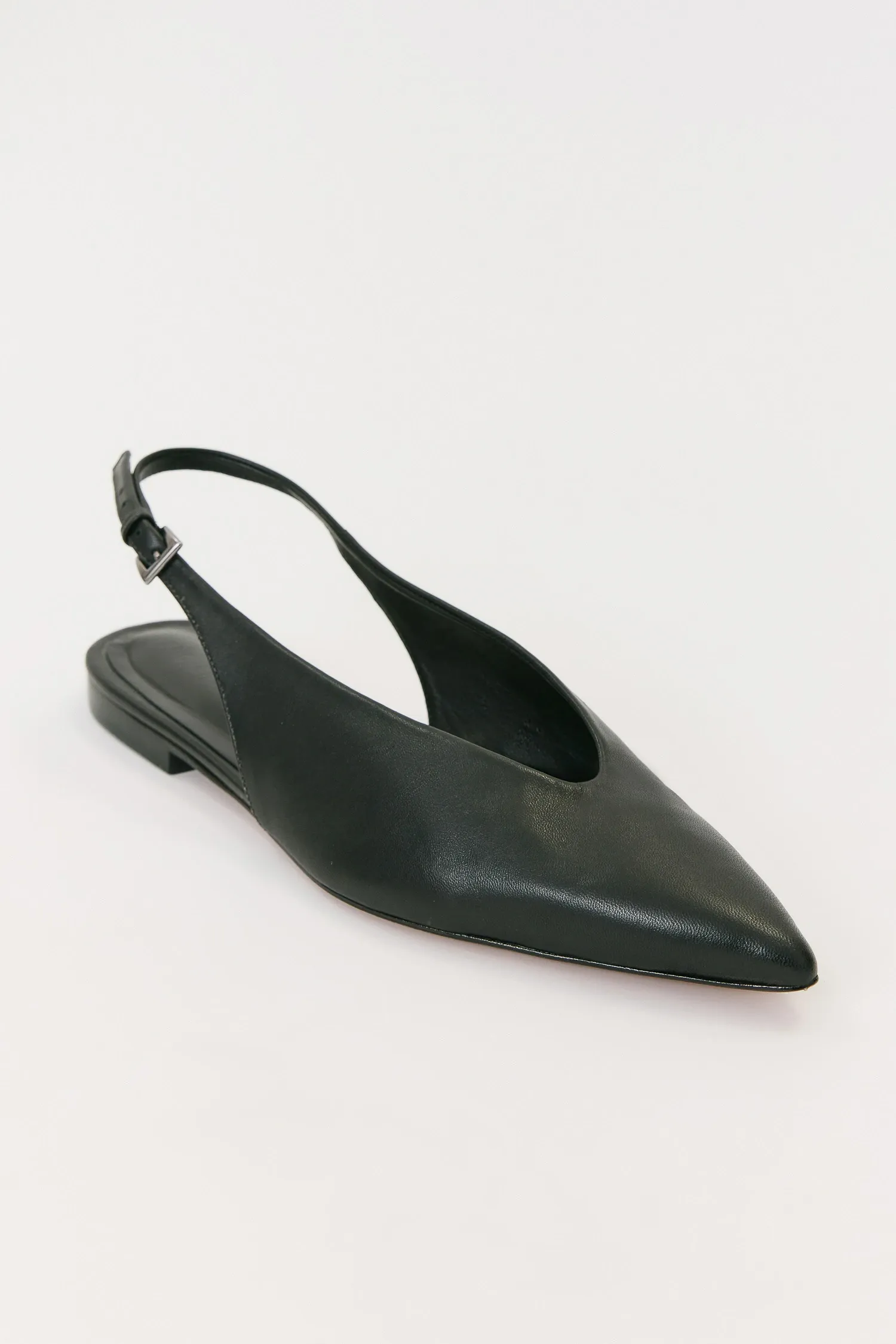 Sapato de bico fino em couro na cor Preta. O modelo apresenta laterais abertas, com traseira sustentada por tira ajustável com fivela metálica, para regulagem personalizada no calcanhar. O salto é baixo e estruturado.
