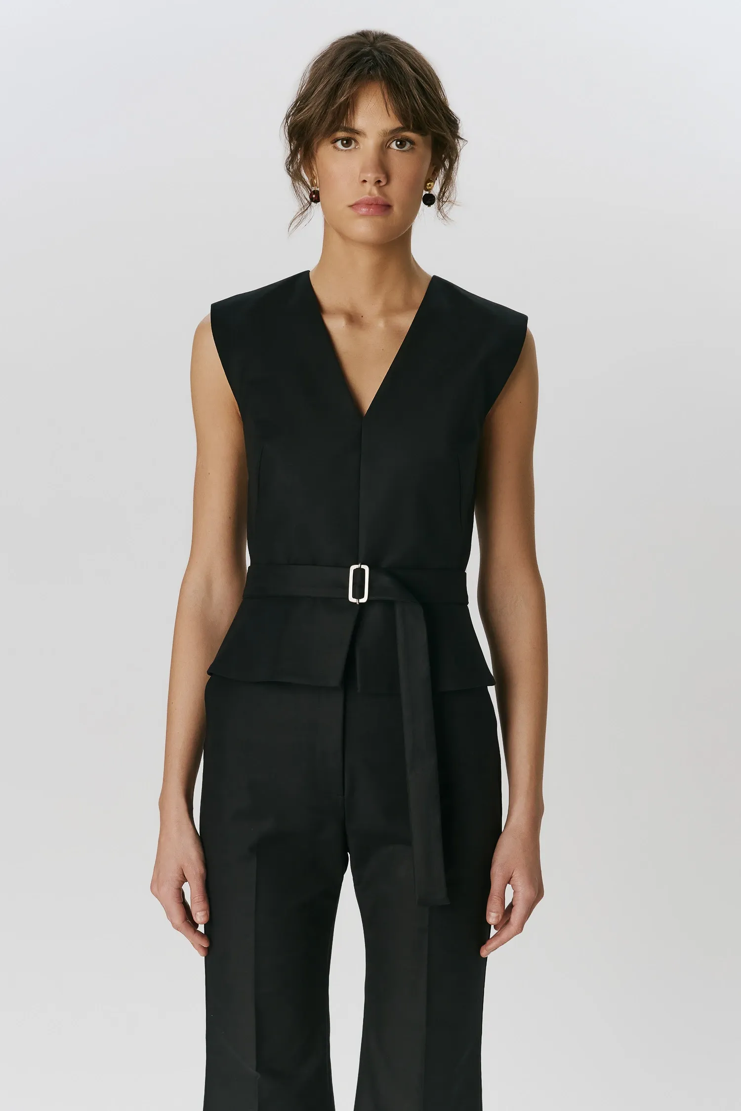 Top de alfaiataria em algodão acetinado na cor Preta. A peça é estruturada e ajustada ao corpo, sem mangas, com decote V sutil e recortes laterais que acinturam a silhueta. O modelo possui basque curta e estruturada abaixo da cintura. Fechamento por zíper invisível no centro das costas. Acompanha cinto faixa avulso do mesmo tecido com fivela de metal. O tecido utilizado possui baixa elasticidade.