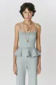 Top de alfaiataria em algodão sarjado na cor Azul Seco. A peça possui modelagem ajustada ao corpo e estruturada por barbatanas. O modelo possui decote reto, alças finas e basque estruturada abaixo da cintura. Fechamento por zíper invisível no centro das costas. O tecido utilizado possui baixa elasticidade.