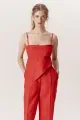 Peça feita em linho puro na cor Vermelha. Top faixa reto com alças finas e aplicação de lenço assimétrico. Fechamento por zíper destacável no centro das costas.