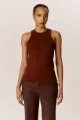 Top em malha compacta na cor Chocolate. Modelo acinturado, sem mangas, com decote redondo e cava profunda. Fechamento por zíper esportivo no centro das costas. O tecido utilizado possui baixa elasticidade.