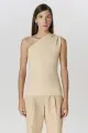 Top em malha compacta na cor Chino. O modelo possui modelagem justa ao corpo com ombro único e detalhe de pregas no ombro. Fechamento por zíper invisível na lateral. O tecido utilizado possui média elasticidade.