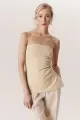 Peça feita em malha compacta de algodão na cor Chino. Top tomara que caia com decote reto, pregas irregulares em um lado da cintura e fenda lateral. Fechamento por zíper invisível na lateral.
