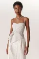 Peça feita em tricoline de algodão com padrão de listras clássico Preto e Branco. Top curto com alças finas e detalhe com pregas diagonais formando um lenço lateral assimétrico. Possui fechamento no centro das costas com zíper destacável.