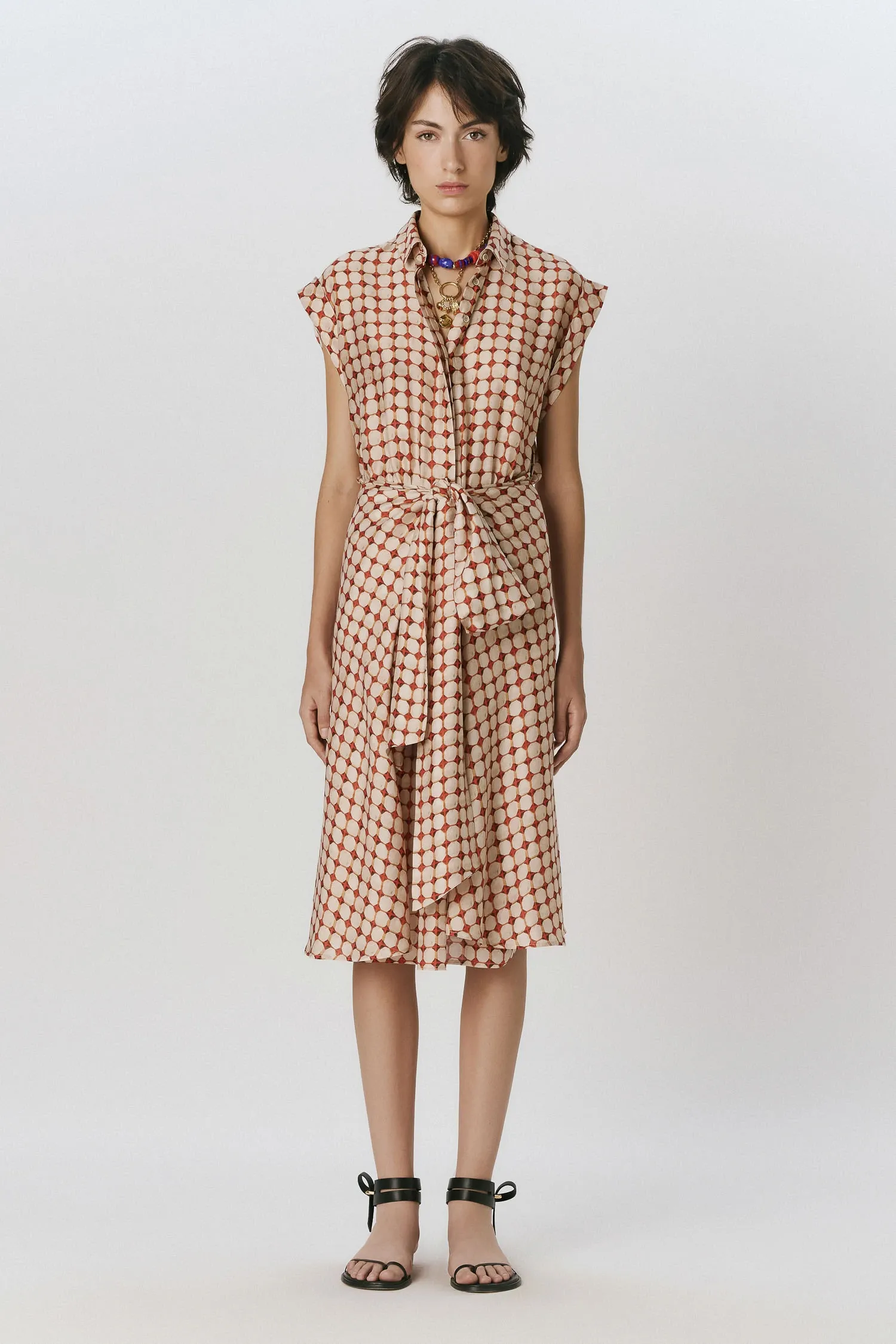 Vestido curto em viscose com seda na estampa Azulejo. Modelo chemise sem mangas com detalhe de dobradura nas cavas. A peça possui modelagem da saia curta com franzido suave e abas laterais formando uma amarração pareô. Fechamento frontal por botões não aparentes e zíper invisível na lateral da saia. O tecido utilizado não possui elasticidade.