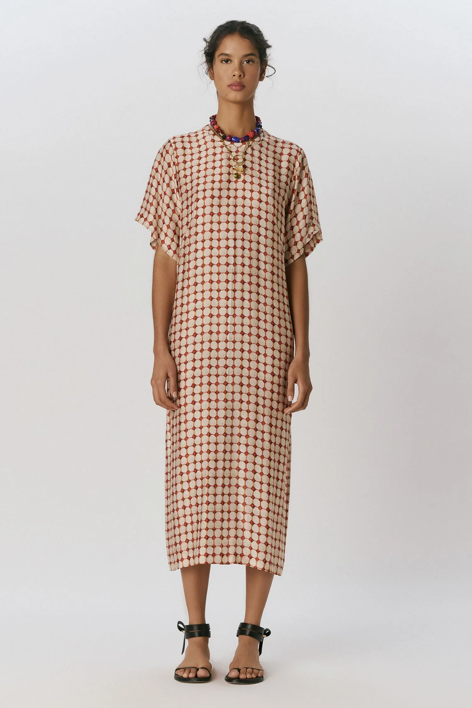 Vestido midi em viscose com seda na estampa Azulejo. O modelo possui mangas curtas, decote redondo e caimento reto. Possui detalhe de fenda na lateral. Fechamento por zíper invisível no centro das costas. O tecido utilizado possui média elasticidade.