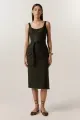 Peça feita em algodão acetinado na cor Preta. Vestido de alfaiataria com corselet estruturado e alças largas formando um decote quadrado. Possui saia reta midi com bolsos faca e fenda lateral. Fechamento por zíper invisível no centro das costas. Acompanha cinto fino avulso do mesmo tecido com meia argola de metal grafite.