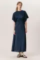 Peça feita em cetim de seda na cor Marinho. Vestido com mangas curtas e detalhe franzido no centro da frente. Possui decote em V profundo nas costas. Fechamento por zíper invisível no centro das costas e rolotê de sustentação para o decote.