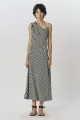 Vestido midi em crepe de seda leve na estampa Diagonal PB. O modelo possui decote degagê assimétrico com detalhe de pregas no ombro do lado direito e alça fina do lado esquerdo. A peça possui saia fluida com pala curta e estruturada no quadril com recortes diagonais. Fechamento por zíper invisível na lateral. O tecido utilizado não possui elasticidade.