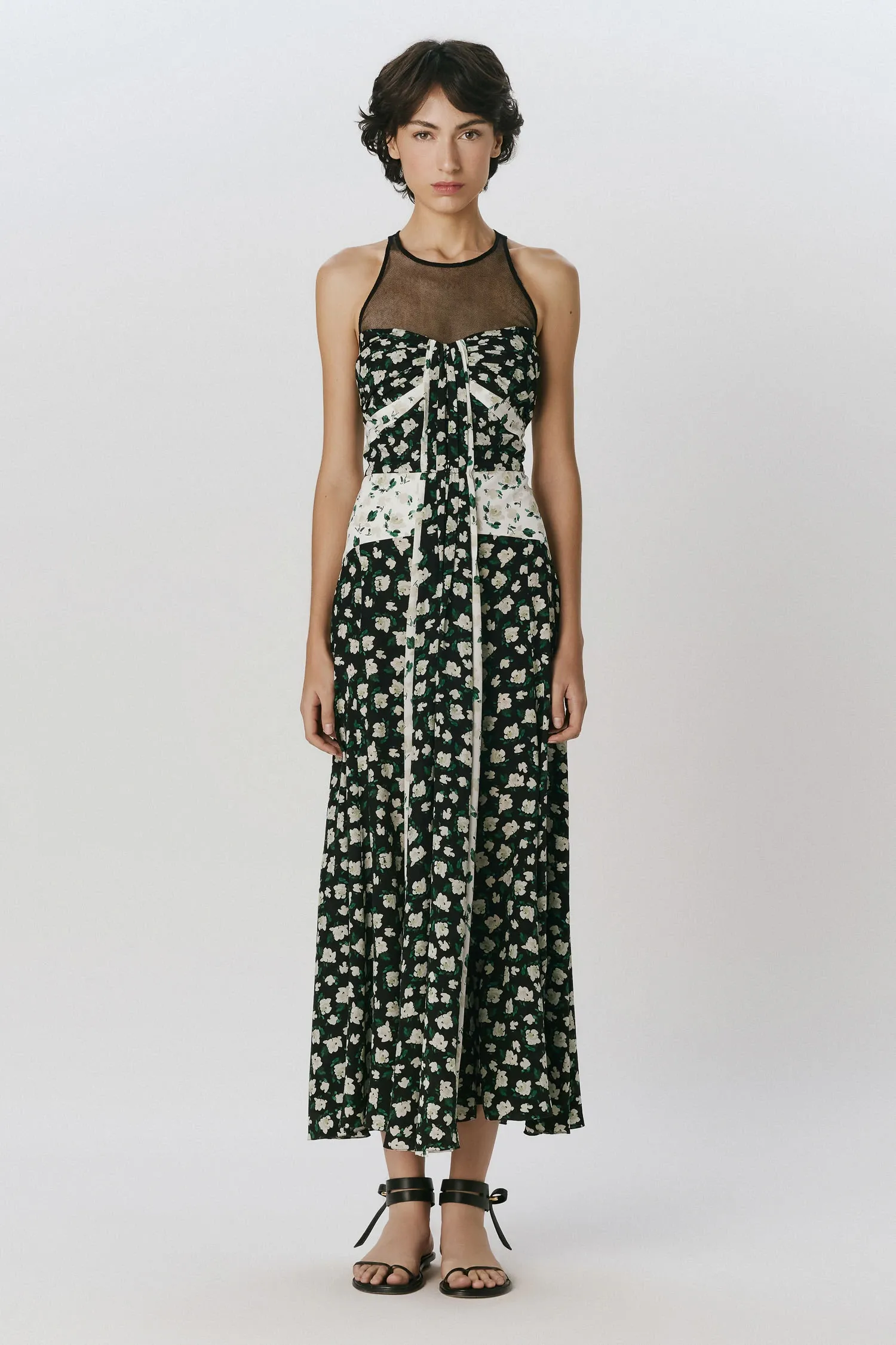 Vestido midi em crepe de seda leve com mix de estampas Peônia. A peça possui top estruturado e ajustado ao corpo com recortes diagonais e detalhes franzidos formando mix de estampas. Possui parte do colo e decote em tule Preto. A saia conta com uma pala curta no quadril e recortes verticais, a modelagem é levemente ajustada ao corpo na área do quadril e mais ampla na base. Detalhe com tecido sobreposto e franzido no centro do vestido fazendo alusão a um lenço solto. Fechamento por zíper invisível no centro das costas. O tecido utilizado não possui elasticidade.